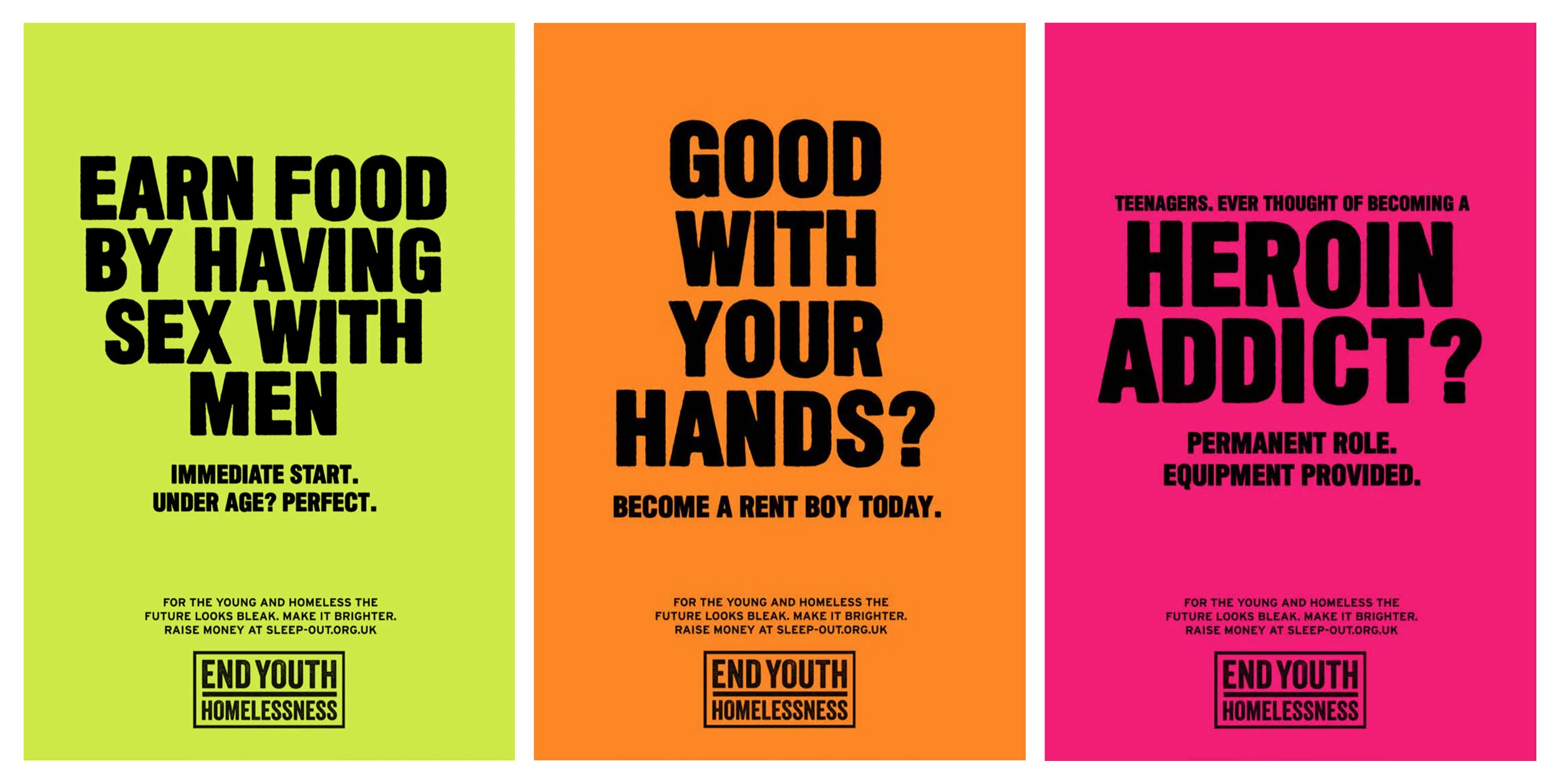The 100,000 young people sleeping rough on our streets have few options, often being forced into illegal work to make ends meet. So we created a series of recruitment ads reflecting the kind of jobs the young and homeless are likely to end up in, if they don’t get the help they need.